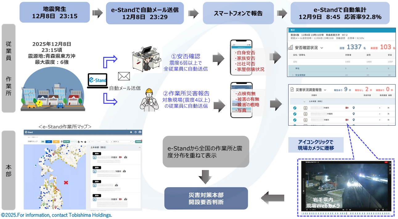 飛島ホールディングス株式会社(以下、当社グループ)は、今回の地震に際し、グループ会社である株式会社ネクストフィールド(以下、ネクストフィールド)が開発・提供する建設現場向け統合ダッシュボードサービス「e-Stand」による安否確認体制が有効に機能し、当社グループ傘下の社員およびグループ各社の建設現場ならびに事業所の状況確認を迅速かつ円滑に完了したことをご報告いたします。現状、事業活動の継続に支障をきたす事態は発生しておりません。